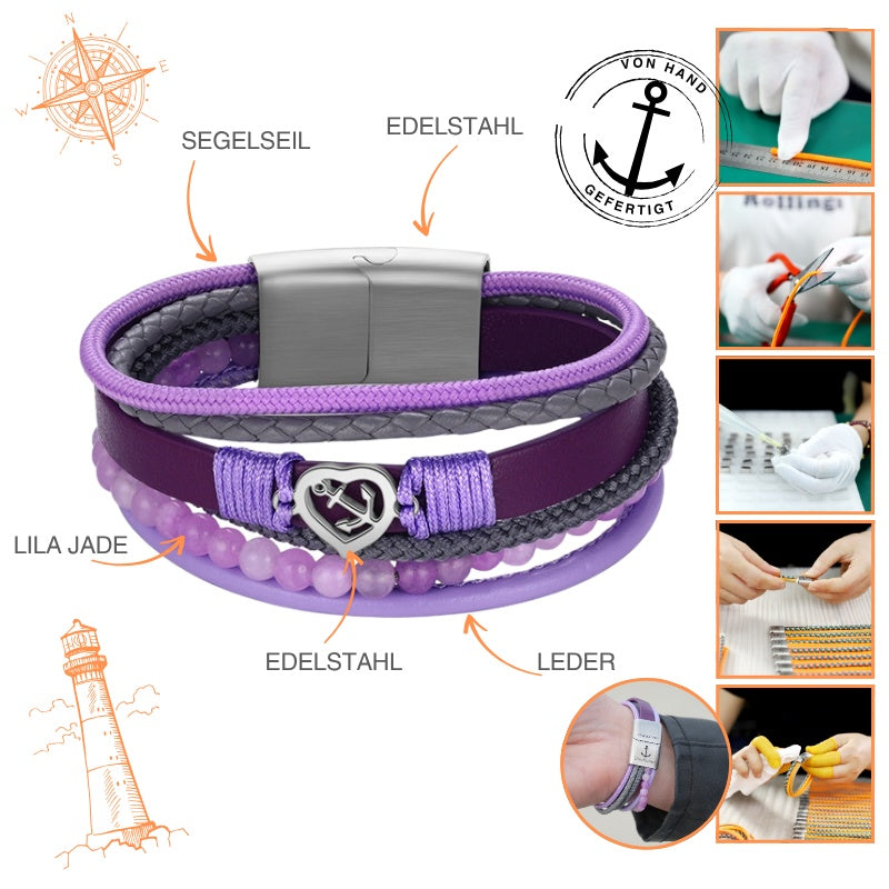 Armband Ankerliebe (Multistrang) mit Segelseil, Leder & Lila Jade