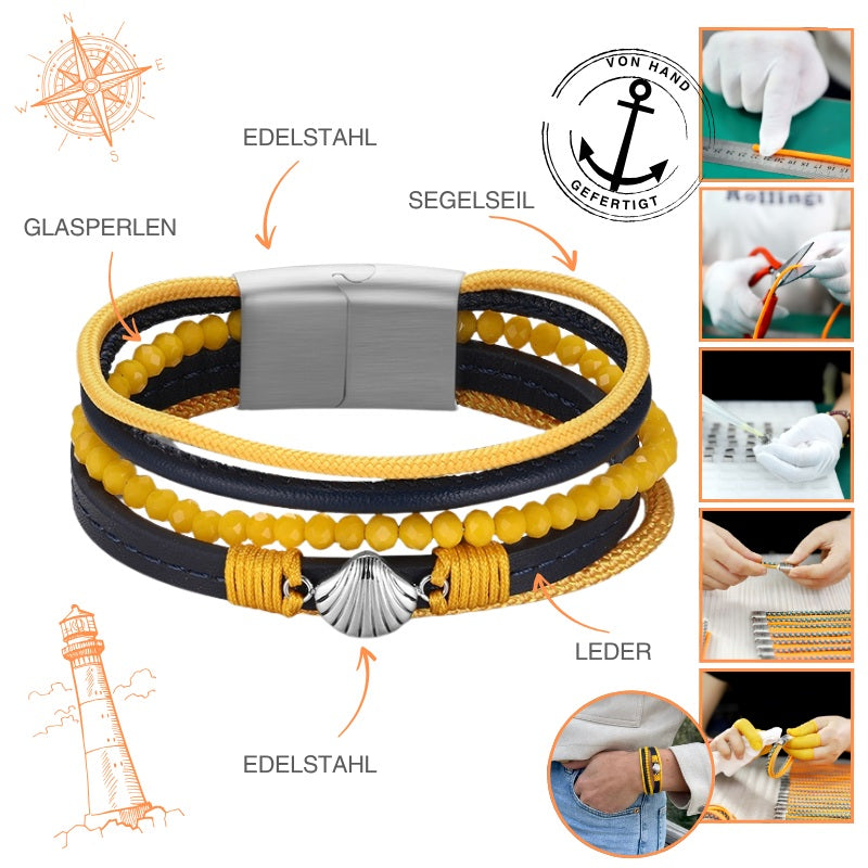 Armband Muschel (Multistrang) mit Segelseil, Leder & Glasperlen