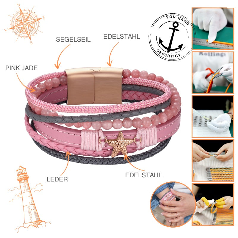 Armband Seestern (Multistrang) mit Segelseil, Leder & Pink Jade