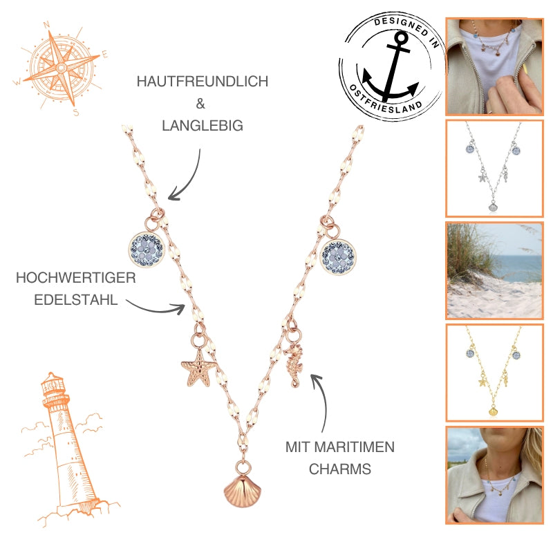 Tauche ein in deine ganz persönliche Meereswelt! Diese elegante Edelstahl Kette mit maritimen Charms ist das Must-have echter Küstengirls. Trage das Meer immer bei dir und vollende deinen Look mit diesem traumhaften Schmuckstück!