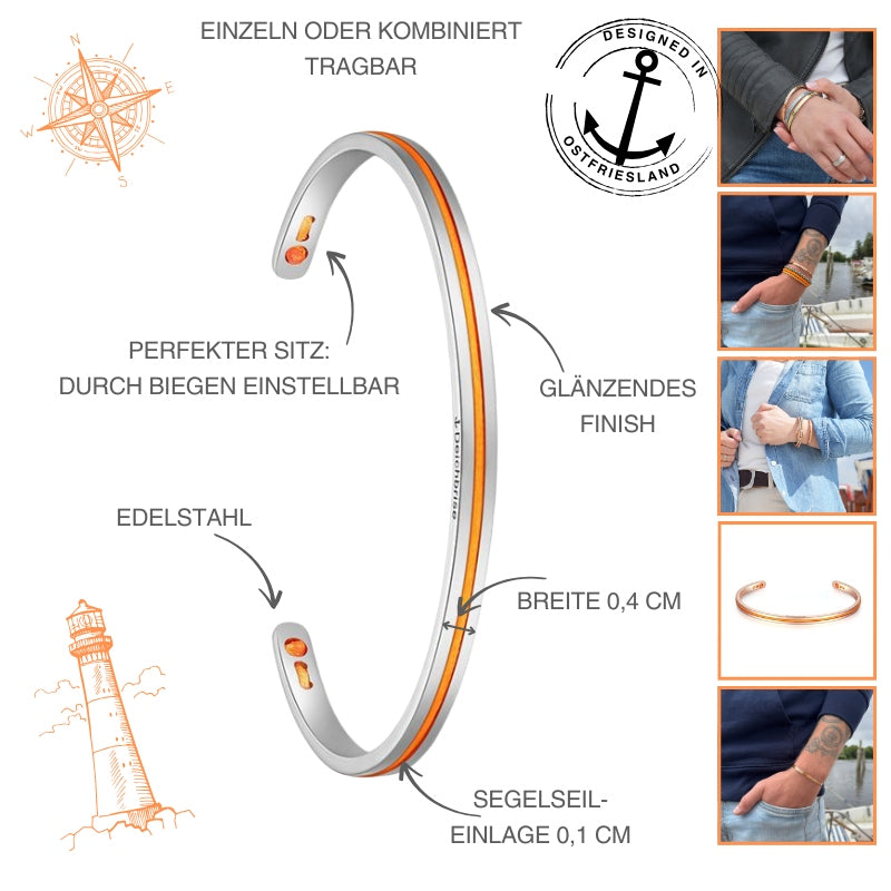 Dann sicher Dir JETZT den Edelstahl-Bangle Amrum mit Segelseil-Einlage. Der Armreif ist aus hochwertigem Edelstahl gefertigt. Das glänzende Finish der Oberfläche gibt dem Armreif den perfekten Style. Die Segelseil-Einlage sorgt gleichzeitig für einen maritimen und sportlichen Look. Trage den Armreif als coole Ergänzung zu deinen Segeltauarmbändern, in Kombination mit weiteren Bangles oder als Partnerschmuck mit den Segelseilarmbändern.