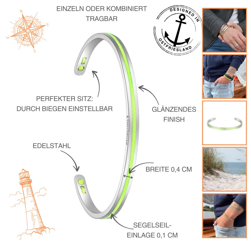 Dann sicher Dir JETZT den Edelstahl-Bangle Kitesurfer mit Segelseil-Einlage. Der Armreif ist aus hochwertigem Edelstahl gefertigt. Das glänzende Finish der Oberfläche gibt dem Armreif den perfekten Style. Die Segelseil-Einlage sorgt gleichzeitig für einen maritimen und sportlichen Look. Trage den Armreif als coole Ergänzung zu deinen Segeltauarmbändern, in Kombination mit weiteren Bangles oder als Partnerschmuck mit den Segelseilarmbändern.