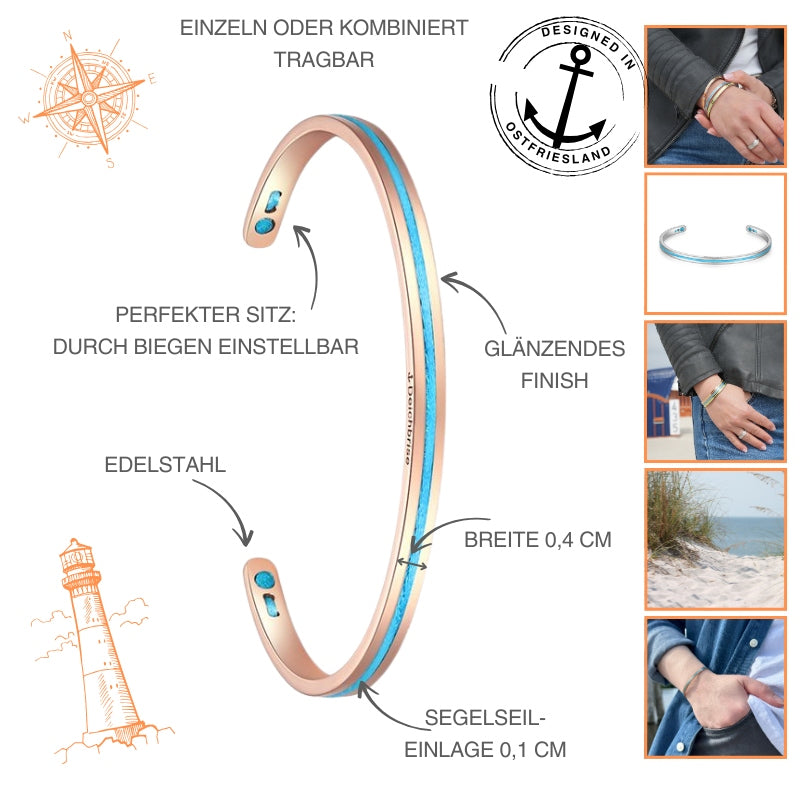 Dann sicher Dir JETZT den Edelstahl-Bangle Meeresrauschen mit Segelseil-Einlage. Der Armreif ist aus hochwertigem Edelstahl gefertigt. Das glänzende Finish der Oberfläche gibt dem Armreif den perfekten Style. Die Segelseil-Einlage sorgt gleichzeitig für einen maritimen und sportlichen Look. Trage den Armreif als coole Ergänzung zu deinen Segeltauarmbändern, in Kombination mit weiteren Bangles oder als Partnerschmuck mit den Segelseilarmbändern.