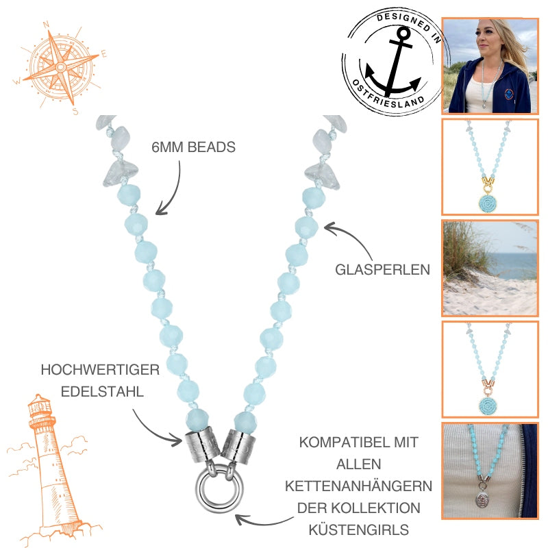 Hellblaue Glasperlen stehen für Ruhe, Klarheit und Gelassenheit – perfekt für alle, die mit offenem Herzen durchs Leben segeln und ihren eigenen Horizont im Blick behalten. Kombiniert mit den maritimen Anhängern unserer Küstengirls-Kollektion entsteht ein Look, der so entspannt und stilvoll ist wie ein Tag am Meer.