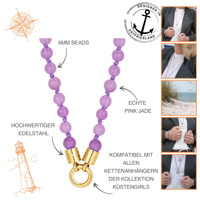 Mystisch wie die Dämmerung über dem Meer und beständig wie die Gezeiten: Diese Kette aus Lila Jade verleiht deinem Look maritimen Charme. Das sanfte Lila erinnert an den Himmel kurz nach Sonnenuntergang und bringt elegante Ruhe in jedes Outfit.