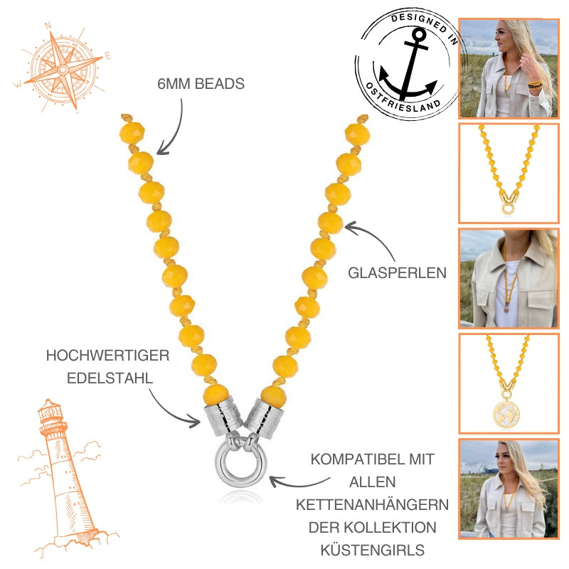 Sommergelbe Glasperlen stehen für Optimismus, Energie und Lebensfreude – perfekt für alle, die das Leben in vollen Zügen genießen und ihren eigenen Kurs steuern. Kombiniert mit den maritimen Anhängern unserer Küstengirls-Kollektion wird daraus ein echtes Statement: fröhlich, frei und voller Sommerfeeling.