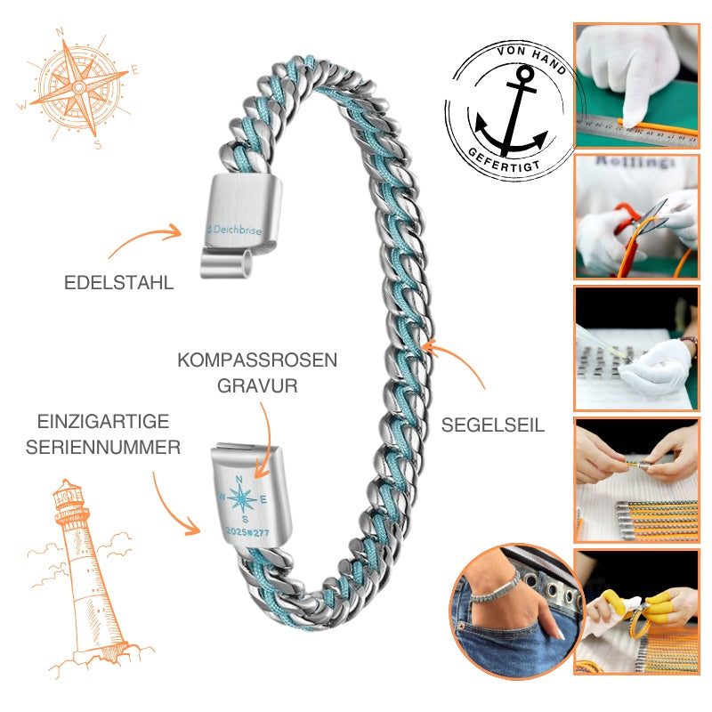 Das Armband Frozen Beach für Küstengirls ist eine schöne Kombination aus kräftigem Stahl und einem frostblauen Segelseil. Das Tau ist zwischen das Stahl geflochten und gibt dem Armband dadurch einen maritimen Look. Ein Highlight dieses Schmuckstückes: die markante Kompassrosen-Gravur - ein Muss für jedes Küstengirl! Jedes Armband ist in einer farblich passenden Geschenkbox verpackt!
