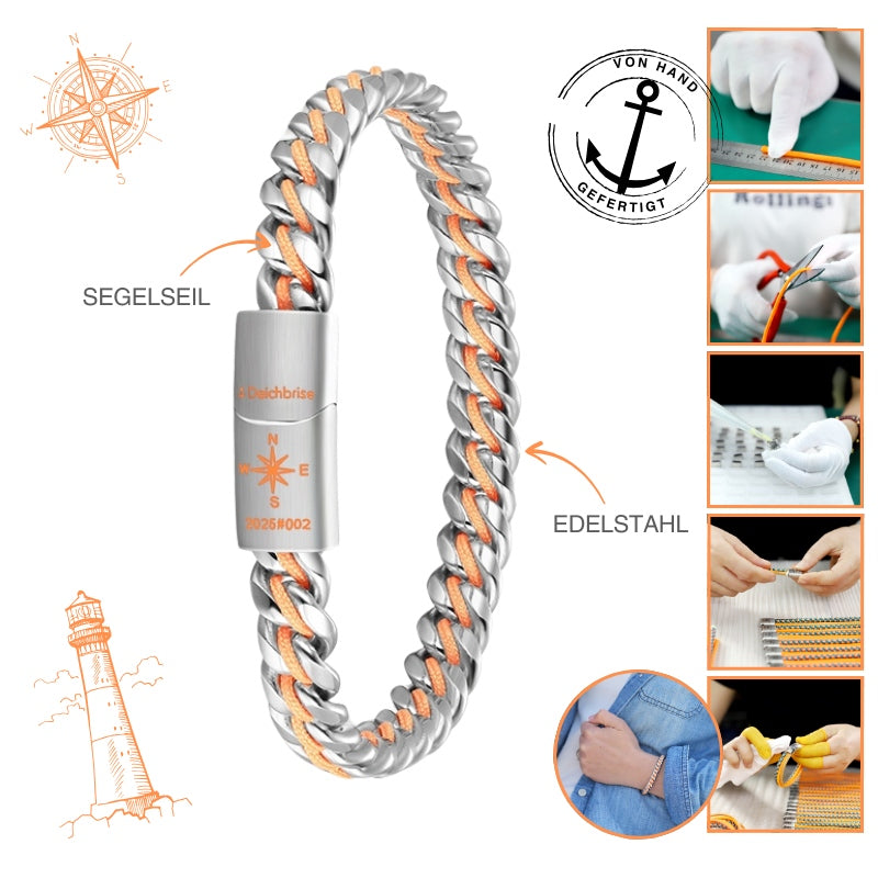 Das Armband Steel Amrum für Küstengirls ist eine schöne Kombination aus kräftigem Stahl und mandarinen-orangem Segelseil. Das Tau ist zwischen das Stahl geflochten und gibt dem Armband dadurch einen maritimen Look. Ein Highlight dieses Schmuckstückes: die markante Kompassrosen-Gravur - ein Muss für jedes Küstengirl! Jedes Armband ist in einer farblich passenden Geschenkbox verpackt!