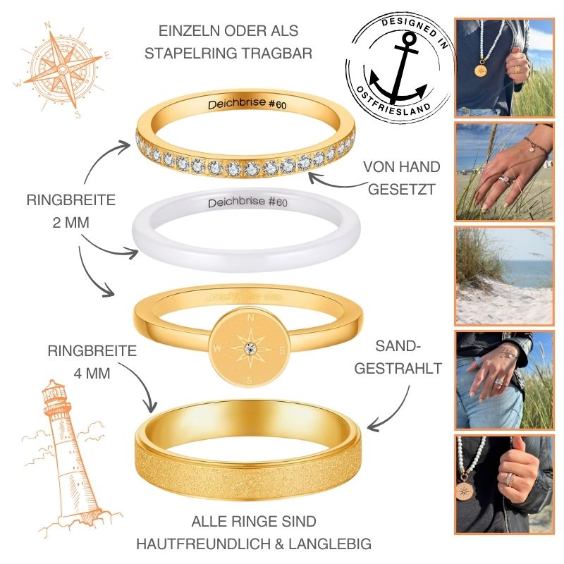 Das maritime Ringset Dünentraum vereint vier charaktervolle Designs zu einem Ensemble von zeitloser Schönheit: ein makellos weißer Keramikring, ein Edelstahlring mit Kompassmotiv, ein sandgestrahlter Ring mit leicht rauer, strukturierter Textur sowie ein glanzvoller Bling-Ring, dessen Steine einzeln von Hand gesetzt wurden. Jeder Ring strahlt für sich – und gemeinsam entfalten sie eine traumhafte Harmonie, die maritime Leichtigkeit mit raffinierter Eleganz verbindet. Vielseitig kombinierbar, von casual bis glamourös.