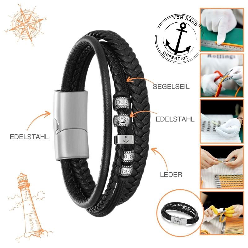 Dieses Jubiläumsarmband spiegelt 8 Jahre unserer Reise wider: handgefertigt aus robustem Leder und Segelseil, kombiniert mit hochwertigem Edelstahl, inspiriert vom maritimen Lebensgefühl.