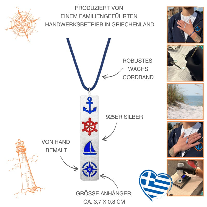 Diese maritime Kette besteht aus hochwertigem 925er Silber und einem Band aus robustem Wachs-Cord, welches um 5 cm erweitert werden kann.