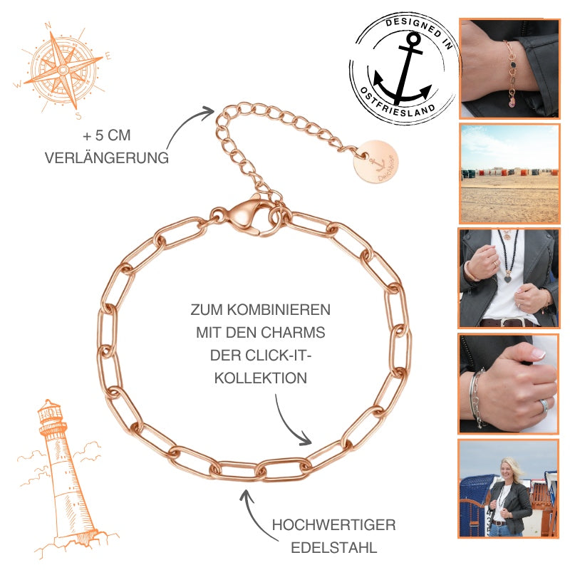 Ob maritim, verspielt oder sportlich-elegant – du entscheidest, welche Charms dein Handgelenk schmücken. Das Armband passt zu allen Charms der Click-it Kollektion und lässt sich ganz nach deinem Stil gestalten.