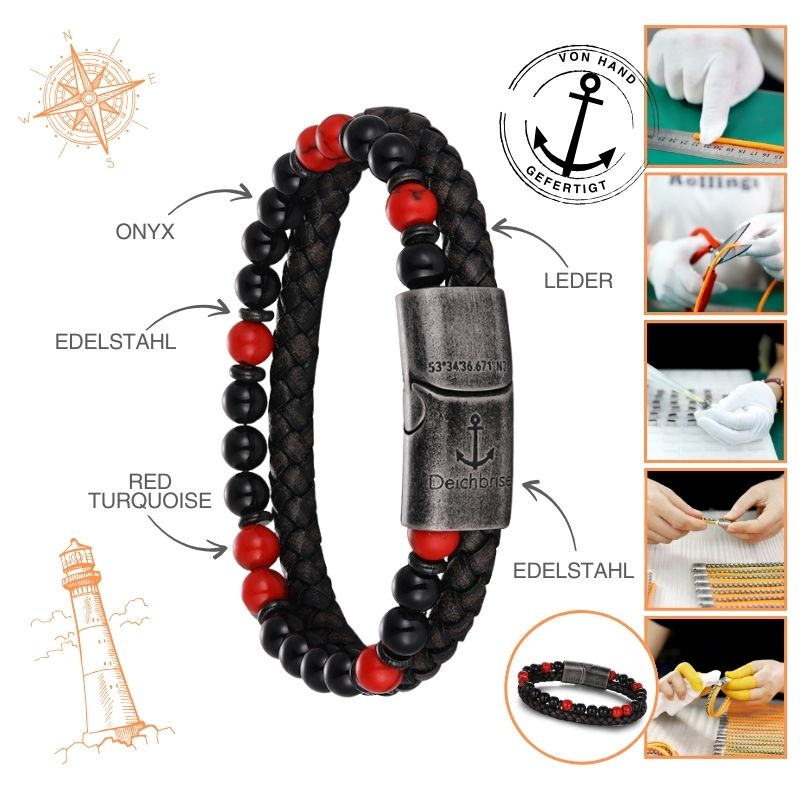 Schwarzer Onyx trifft auf Red Turquoise, ergänzt durch robustes Leder und kühlen Edelstahl: klar, reduziert und voller Charakter. Ein Armband für Männer, die die Kraft und Ruhe der Küste spüren wollen. Jedes Stück ist ein Unikat aus echten Steinen und somit ein persönliches Meisterwerk der Natur.