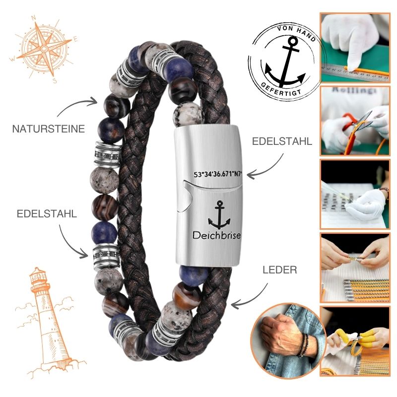 Dieses Armband verbindet maritimen Charme mit urbanem Style – spüre die Freiheit der Küste in deinem Alltag, als würdest du barfuß durch die Brandung gehen. Natürliche Steine wie Achat, Feuerstein und Sodalith bringen in Kombination mit dem geflochtenen Lederstrang die Farben des Meeres direkt an dein Handgelenk: von sanftem Grau über tiefes Blau bis zu erdigen Nuancen.