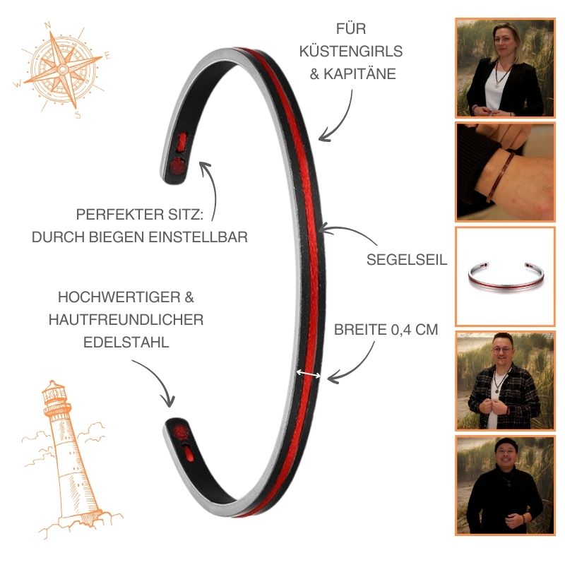 Maritim und sportlich-chic soll es sein? Zum Anzug tragbar und auch zur Jeans? Dann sicher Dir JETZT den Edelstahl-Bangle Seegang mit der küstenroten Segelseil-Einlage. Der Armreif ist aus hochwertigem Edelstahl mit einem feinen Finish gefertigt. Die Segelseil-Einlage sorgt für einen maritimen und gleichzeitig sportlichen Look. Trage den Armreif als coole Ergänzung zu deinen Segeltauarmbändern, in Kombination mit weiteren Bangles oder als Partnerschmuck mit den Segelseilarmbändern.