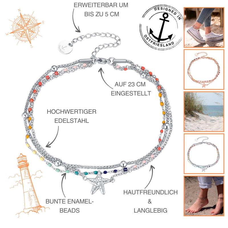Nicer Look, im Boho-Style! Unser Fußkettchen aus Edelstahl Boho-Seestern ist die maritime Ergänzung für jedes Outfit. Die Layer-Optik macht dieses Fußkettchen zu einem echten Hingucker. Einfach anziehen - fertig ist dein Sommer Look!