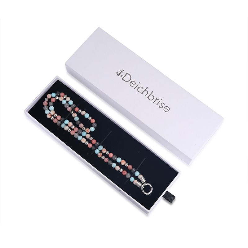 Die maritime Kette aus Pink Jade, Quarz-Kristall und Rotem Netz Jaspis mit praktischem Rundkarabiner vereint Harmonie, Klarheit und Erdung in einem eleganten Edelstein-Mix. Sanft und natürlich, lässt sie sich perfekt mit Anhängern kombinieren und verleiht jedem Look eine feine und elegante Note.