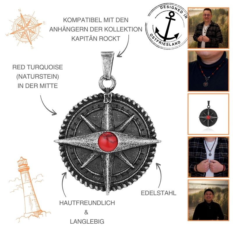 Dieser Kompass Kettenanhänger verbindet maritimes Design mit robustem Material. Er lässt sich mühelos zu schlichten Shirts, Strick oder Hemd tragen und ergänzt sowohl einen urbanen als auch einen maritimen Look. Der Stein in der Mitte wirkt stabilisierend auf das Design und macht jedes Stück zu einem echten Hingucker.