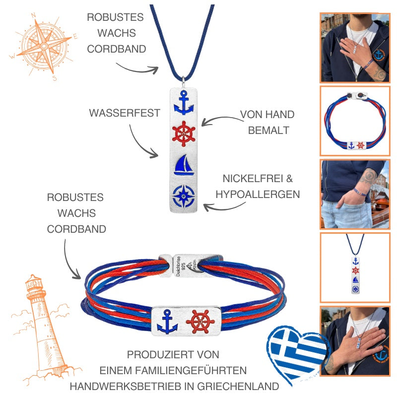 Diese maritime Schmuck-Set für Herren besteht aus einer Kette und einem Armband aus hochwertigem 925er Silber mit einem Band aus robustem Wachs-Cord.