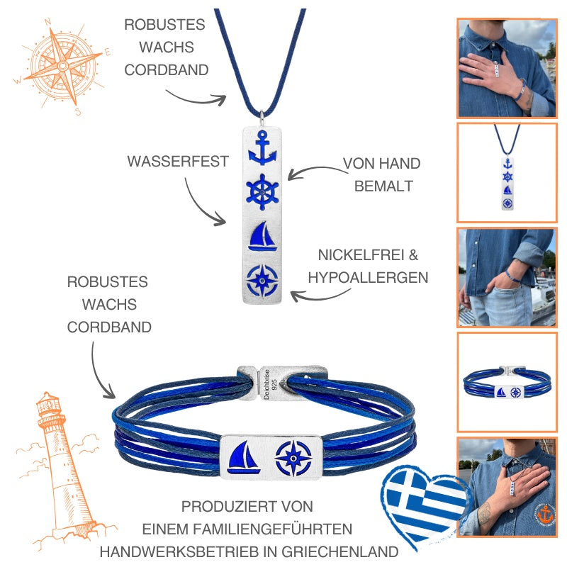 Diese maritime Schmuck-Set für Herren besteht aus einer Kette und einem Armband aus hochwertigem 925er Silber mit einem Band aus robustem Wachs-Cord.
