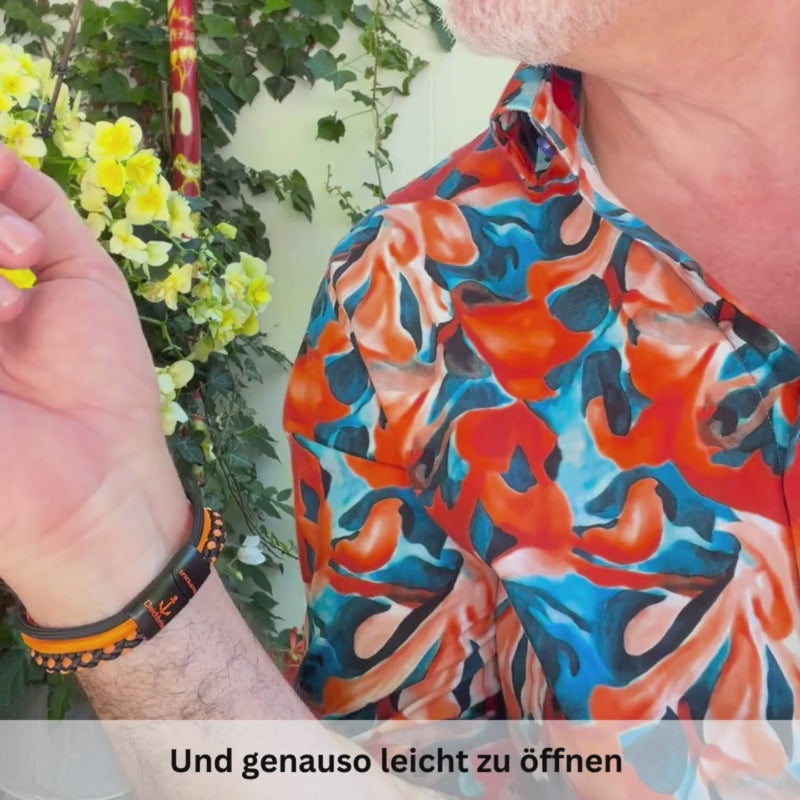 Unser Verschluss ist eine Kombination aus Mechanik und Magnetismus. Du kannst den Verschluss einfach seitlich mit einer Hand öffnen und schließen. Am leichtesten funktioniert dies direkt am Puls.