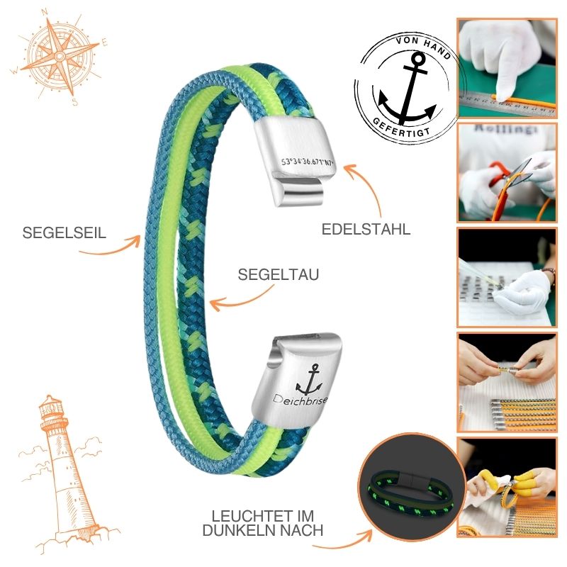 Spüre die Kraft des Ozeans am Handgelenk! „Neptuns Kraft 1“ vereint robuste Segeltau- und Segelseil-Stränge in blaugrün-türkisblau-leuchtgrün, die im Dunkeln geheimnisvoll nachleuchten – wie ein Lichtreflex von Neptun aus den Tiefen des Meeres.
